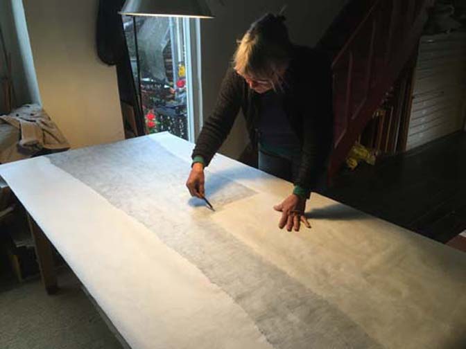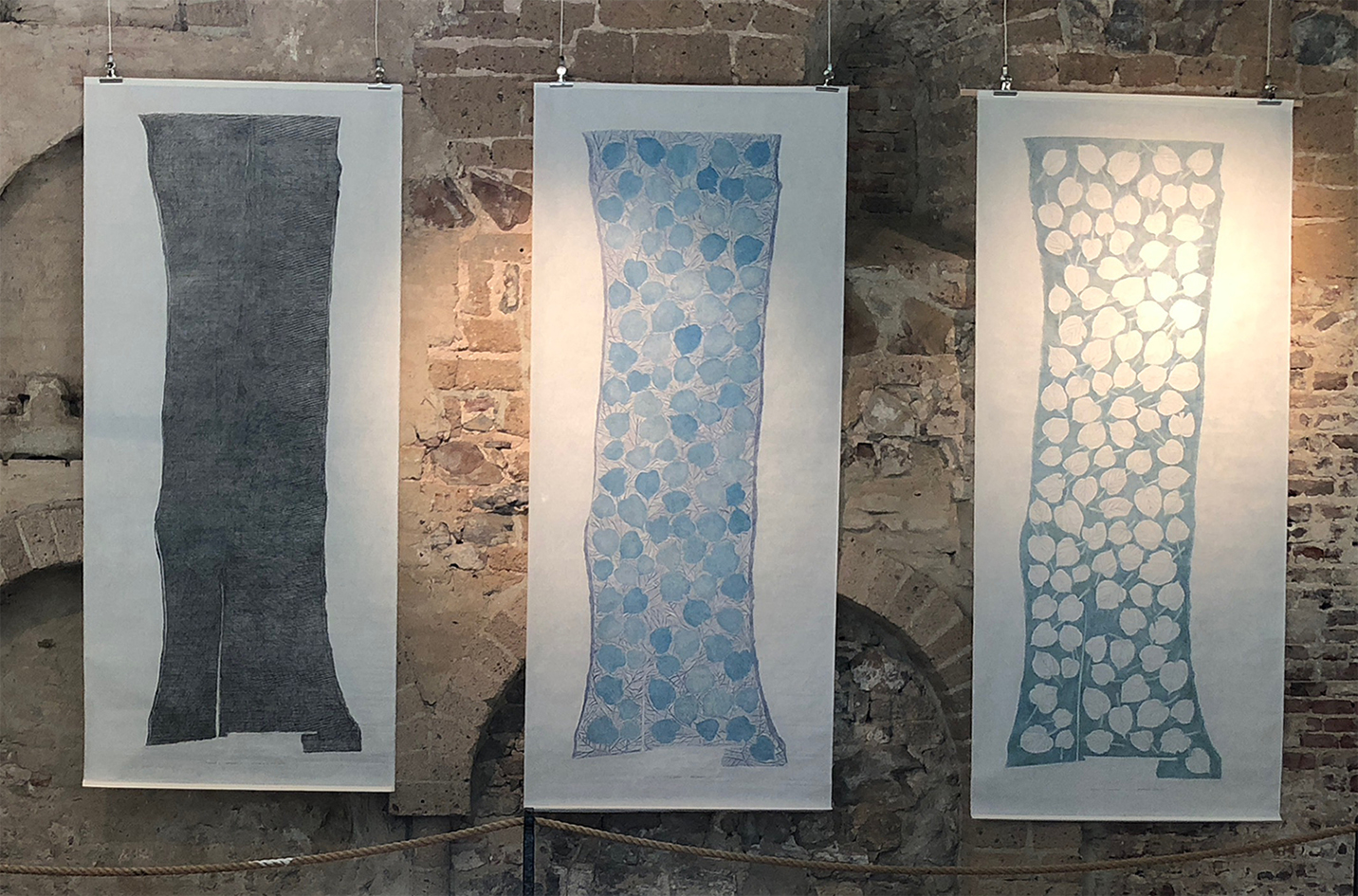 Mijn project Huislinde is een grafisch onderzoek naar de betekenis van een lindeboom die als het ware tot leven kwam in mijn atelier: rubbings en houtdrukken van de dunne plank in verschillende staten.